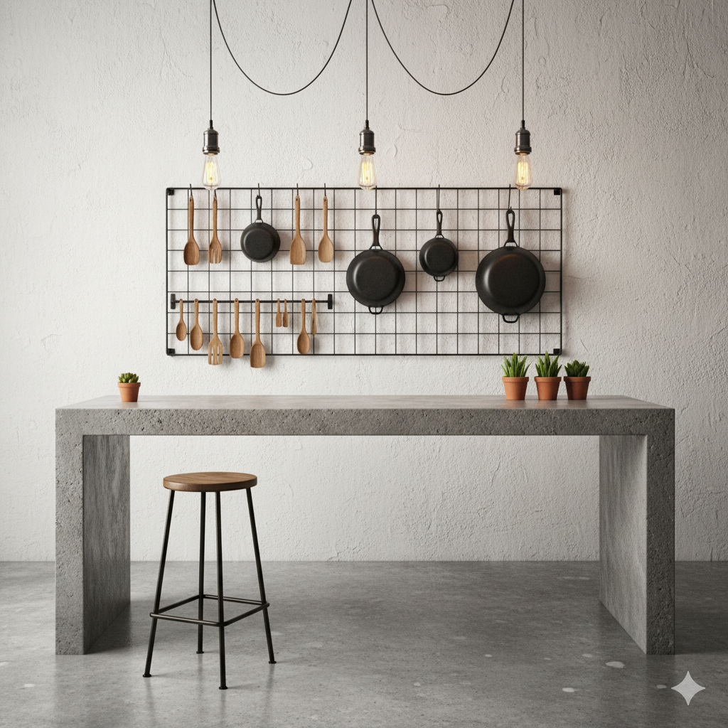 Rak gantung hitam berbentuk grid dipasang di dinding, dengan beberapa wajan dan sendok kayu tergantung rapi. Dihiasi dengan lampu bohlam gantung industrial dan meja beton ekspos, kombinasi ini menghadirkan suasana dapur minimalis yang tetap stylish.