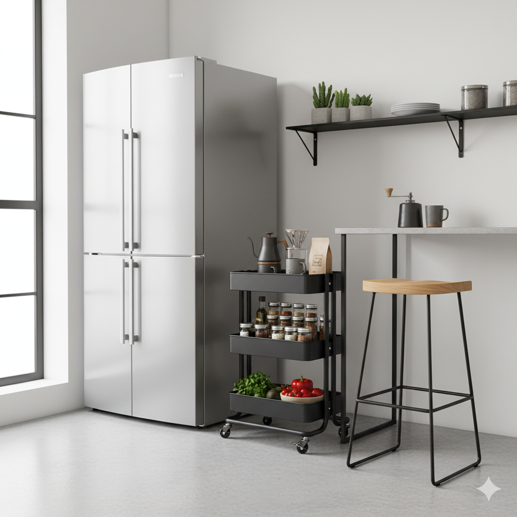 Troli besi dengan tiga tingkat rak berwarna hitam matte, diletakkan di samping kulkas. Di rak atas, letakkan peralatan kopi. Rak tengah diisi bumbu masak, sementara rak bawah untuk sayuran segar. Cocok dipadukan dengan kursi bar kayu dan rak gantung besi di dinding untuk melengkapi gaya modern.
