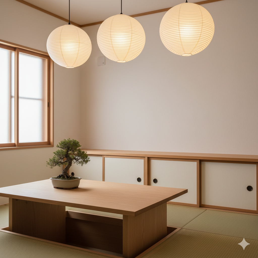 Rak kayu rendah dengan pintu geser shoji berwarna krem, dipadukan dengan meja kayu rendah sebagai area kerja. Gunakan lampu gantung berbahan kertas (chōchin) dan tambahkan tanaman bonsai kecil di sudut meja. Warna furnitur natural seperti cokelat muda dan putih gading menciptakan nuansa ala Jepang yang tenang.