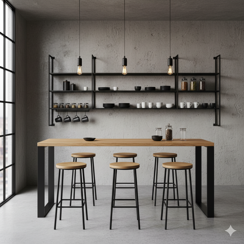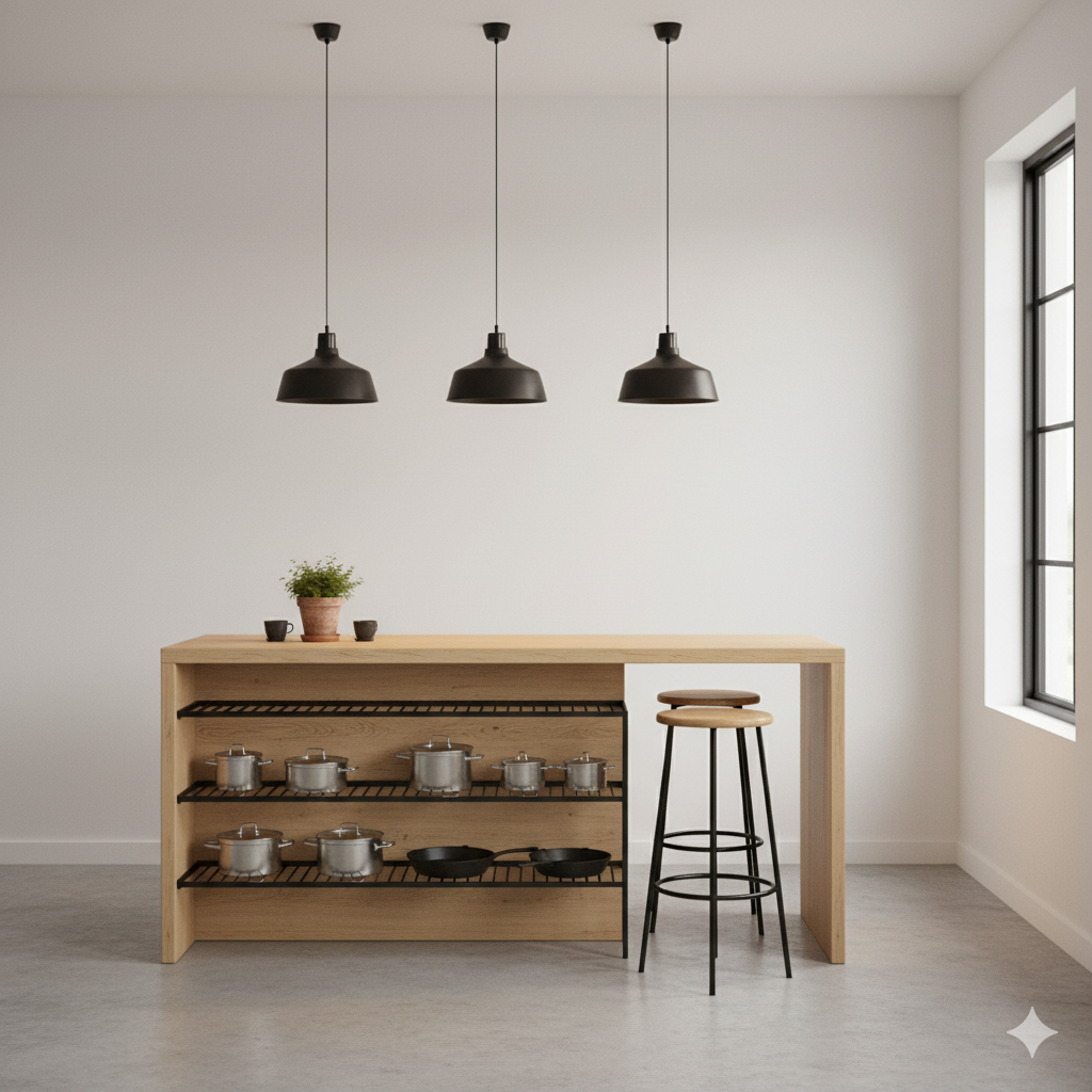 Meja kayu dengan finishing natural, dilengkapi rak besi di bawahnya untuk menyimpan panci kecil. Tambahkan kursi lipat kayu atau stool tinggi, serta lampu gantung minimalis di atas meja untuk mempertegas area kerja.